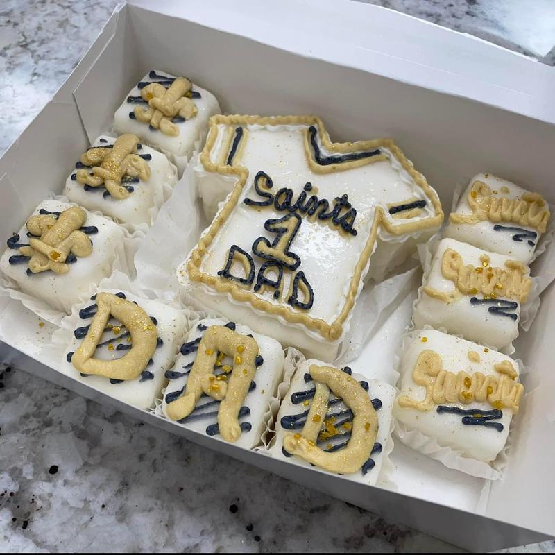 This Gift Box is Perfect for All Occasions! Wrapped with ribbon and filled with One Mini Cake, Eight- Nine Petit Fours (depending on shape of mini cake) and we can personalize a message to be written on top of your mini cake